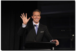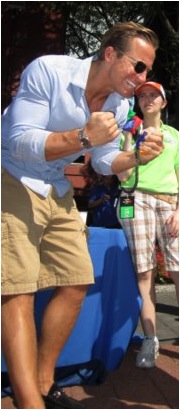 Wragge clearly knows he’s the resident sexpot at The Early Show. I get the impression his self-consciousness at being extensively videotaped in muscle-hugging lycra isn’t exactly born out of embarrassment. Towering over his triathlon veteran buddy after the race, it’s hard to miss the cold hard fact that he’s a big, beautiful, muscled pretty boy who enjoys showing off his side cleavage, big round shoulders, and bulging biceps.