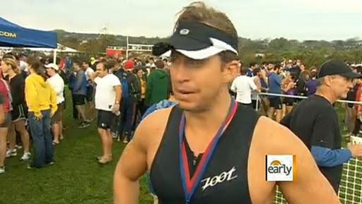 a gratuitously long segment on his training and completion of the Montauk Mightyman triathlon. Yes. This is national news that a former college athlete (ivy league football? um, let’s just say he was a big man on campus), swam, cycled, and jogged his way across the tip of Long Island. What, you say? That doesn’t sound like national network news? Have you seen this man’s chest?