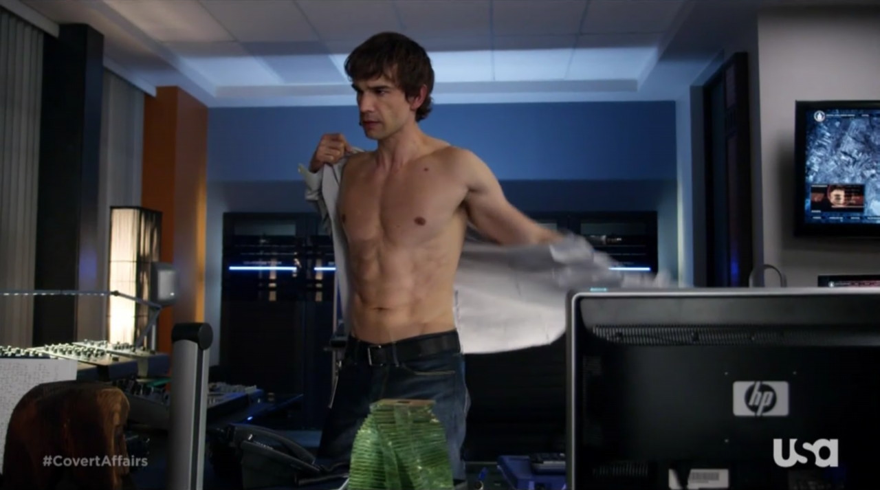 Gorham, who’s also consistently showing skin (and a fucking insane 8-pack!) in Covert Affairs shows up to his match (in my imagination) with Jerry with a plan ready to orchestrate. It involves Jerry’s wife, his brother, and a hypnotically magical kiss (not to mention Christopher’s raging erection pressed against Jerry’s body as he milks out the last ounces of a body scissors submission).