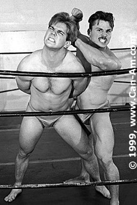 No one, but no one bends and suffers like Brad Rochelle. I’ve spilt plenty of ink marveling at Brad’s capture across the knee of Jeff Phoenix in the past, but I simply have to include another OTK capture of Brad, displaying another great option for the hold. I can’t sleuth out what match this pic is from, but I think this heel is Sid O’Reilly. He’s illustrating another great use of an OTK, which is to claw the crap out of a muscleboy’s exposed six pack. The heel’s fingertips look seriously dug in there, and Brad is letting us know what it feels like to have someone’s claws rearrange your internal organs from the outside.