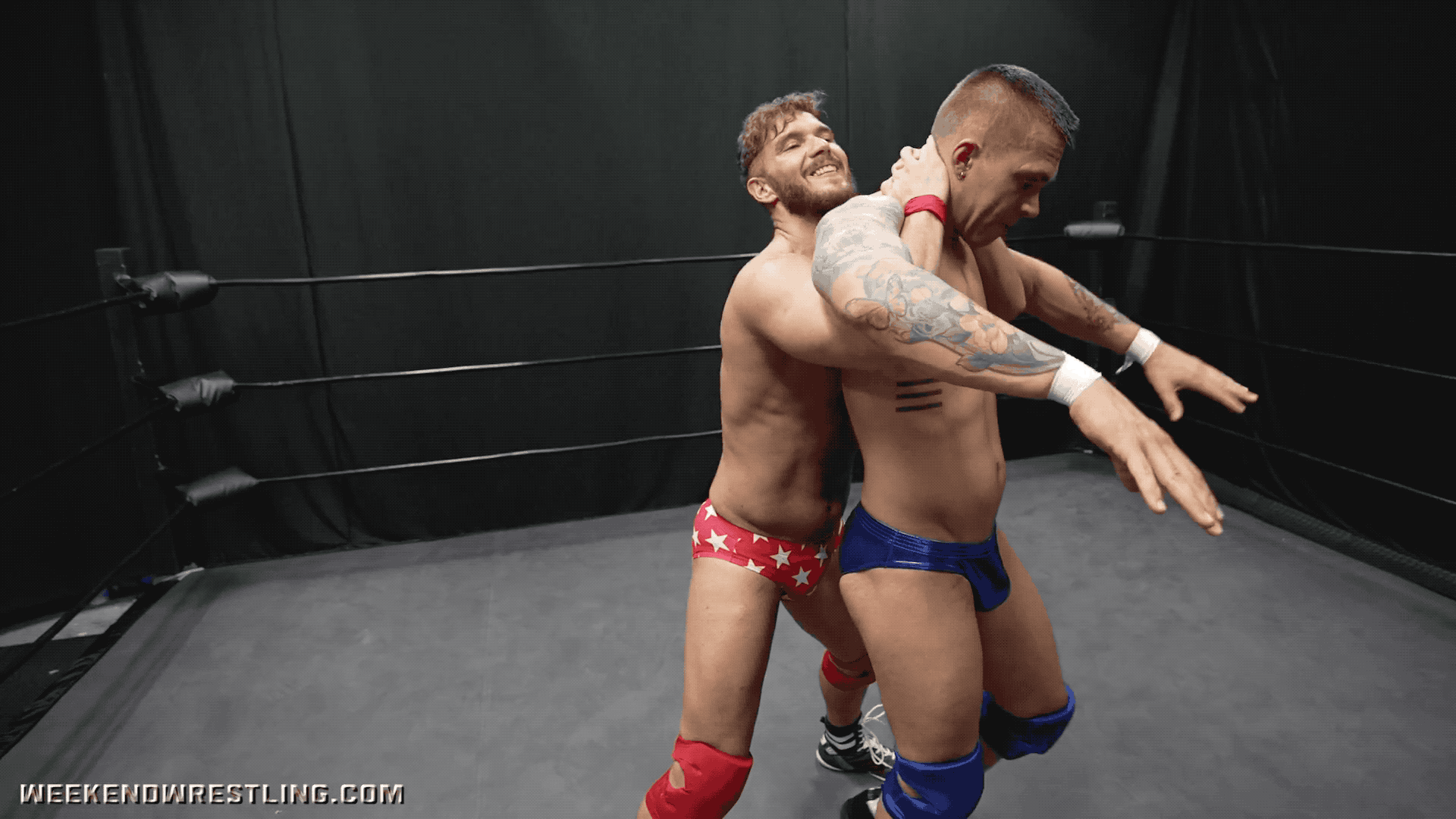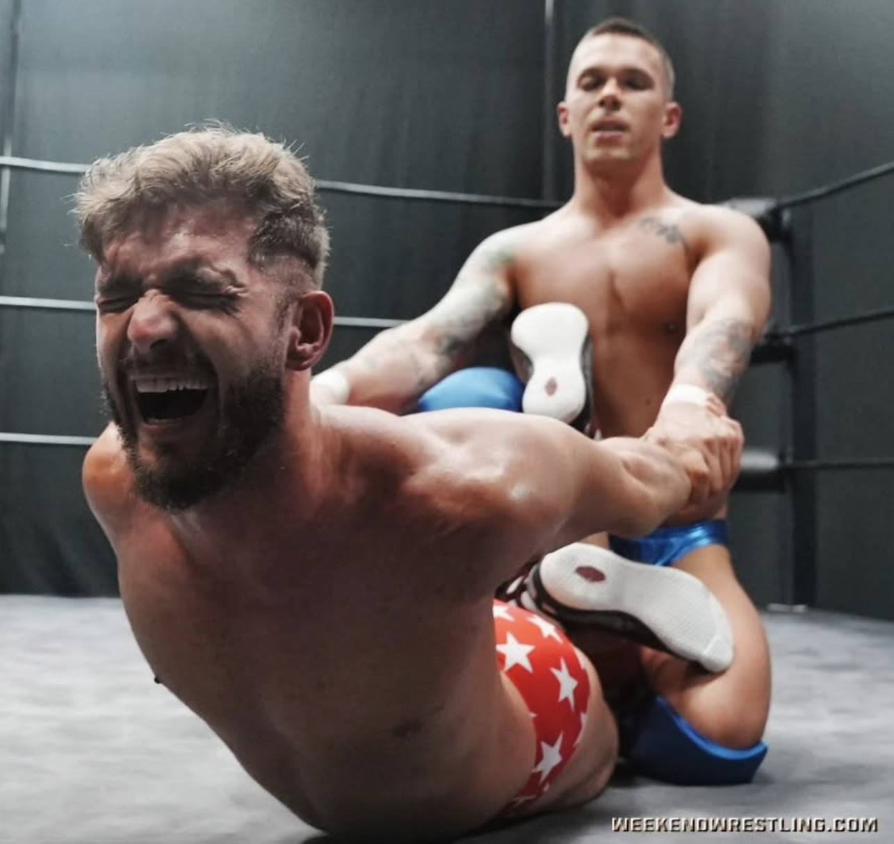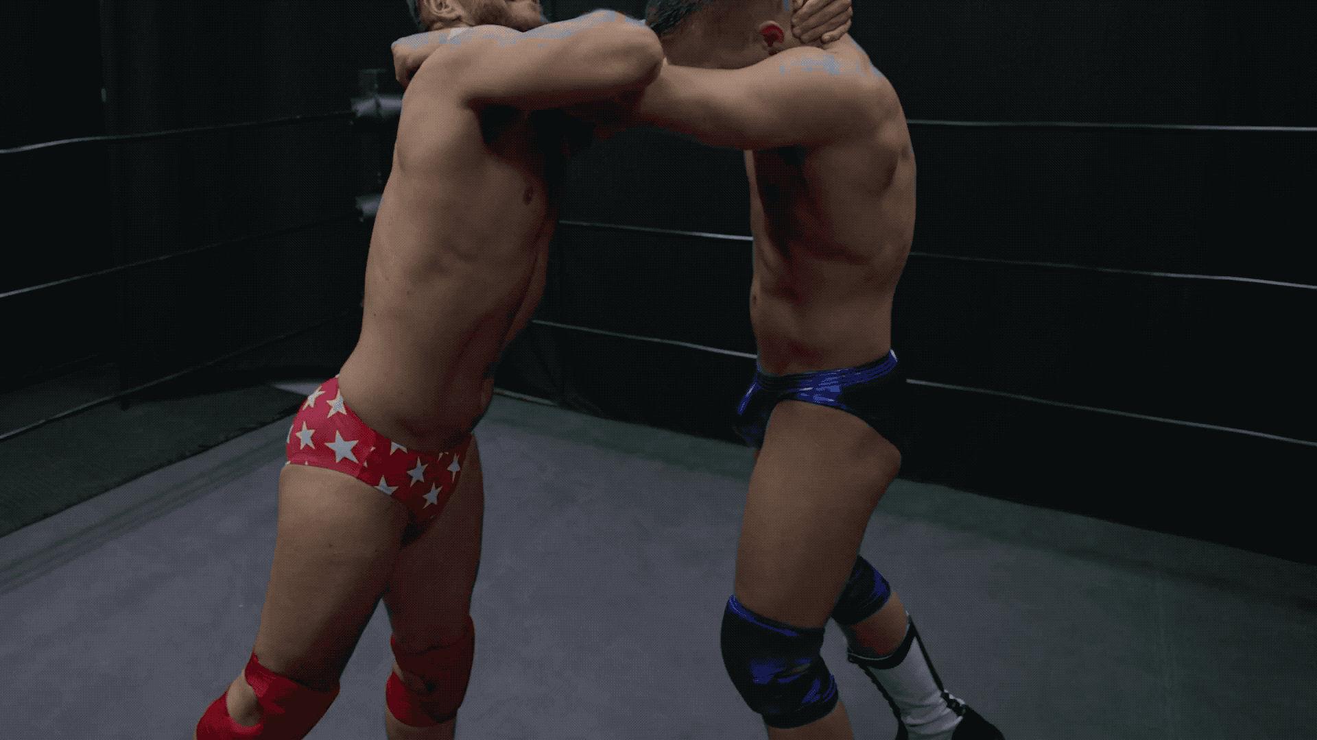 It’s the low blows that tip this battle of near equals over the edge. Stefan is literally begging, “Please, no more ball shots,” after he takes a solid jab to the crotch. Of course, his pleading earns him almost immediately a blindside knee to testicles from behind, that leaves the sweaty hot jock weeping, ready to get swept up and dumped in the trash can once Eliot’s soothed his threatened status as the nasty sadist in gorgeous babyface clothing. But holy shit, did Stefan Stone come from out of nowhere and out-pretty, out muscle, and nearly out wrestle Elite-fucking-Eliot!?