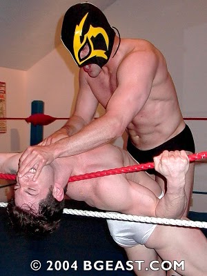 He remains creepily quiet in his matches, which is a challenge for someone like me that lives for the humiliating dialogue in the ring. Nevertheless, he communicates it all with great skill. He grunts, gasps and groans, and I find myself on the edge of my seat waiting for the next sound to get pummeled out of that massive chest. Despite his notorious humiliation of an already destroyed Brad, the Enforcer is no untouchable squasher. He takes his hits (and occasionally, licks). He suffers and squirms. That big, powerful body gets as good as it gives. And in Masked Mayhem 7, once again, he turns me into a grunting, gasping, groaning mess. And for that, the Enforcer is my homoerotic wrestler of the month.