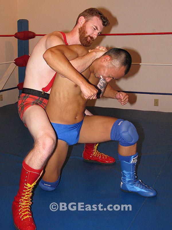 Chase has always been the master of punishing pro wrestling holds. These days, he serves up those innovative and intricate combo holds with even more indulgent helpings of erotic humiliation. For example, he plants Forrest in a tree of woe and stomps the living shit out of the hot little leprechaun, pounding the redhead down until the back of Forrest’s head rests on the mat. Then Chase adds insult to injury by sitting on Forrest’s face, just smothering the lucky little fucker under the Charming One’s beautiful cheeks. “How’s that vision quest working out for you so far?!”