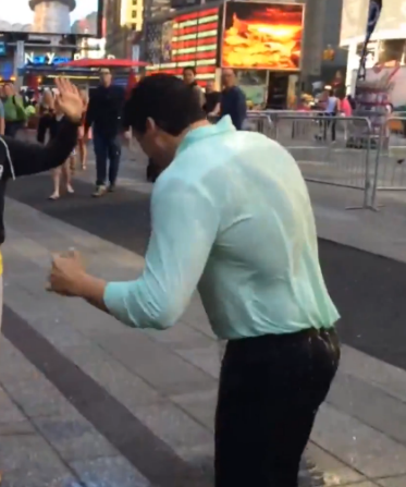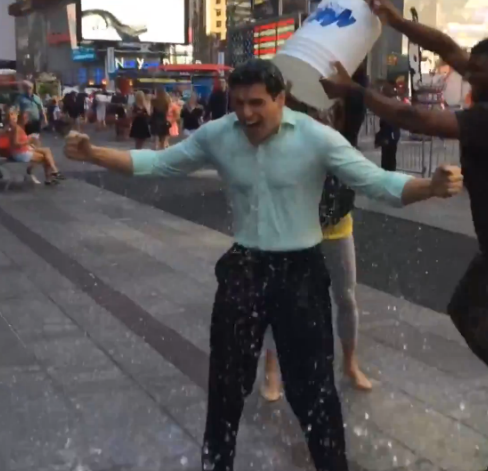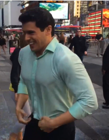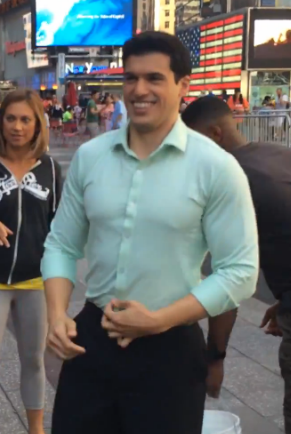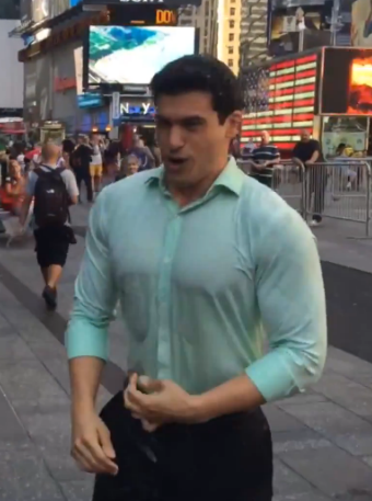 Gio did, indeed, permit himself to be doused in ice water, and you know for a fact I was studying that slice of heaven frame by frame for hours on end. The bodybuilding rookie made the fashion faux pas of wearing an albeit extremely tight but knit button up shirt. If you are unclear why this is a faux pas, go back to last Friday’s assessment of David Muir’s more seasoned and perfected ice bucket challenge, in which he wore a thin, white button up that instantly became transparent before water even managed to touch it. Gio’s pastel green knit shirt remains stubbornly opaque, though it does instantly suck to his bulges and crevices alluringly. However, again, the rookie insists on pulling the soaked fabric away from his body, refusing to permit an unadulterated view of the topography in relief beneath. Silly rookie. Still, nothing can quite disguise those mountainous pecs (though there was something even more erotic about David’s nipples on full display), and check out the lat spread when Gio twists around! Holy shit, that back is massive! Honestly, a wrestling opponent would have to cinch on a bearhug seriously low, because most arms would simply not be able to reach around that circumference. And until that beef is stripped and standing toe to toe in a wrestling ring, the fullest potential of phenomenal Gio is going to go unrealized. Speaking of which…