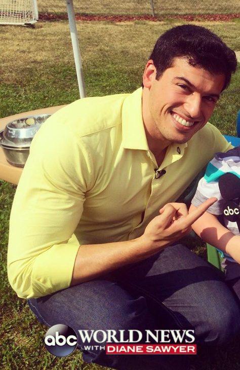 Online commenters have noted the chemistry between David and rising star correspondent Gio Benitez, who’s been a major infatuation of mine lately. Gio gets fluff pieces like being sent to interview the ankle biter with a dearth of humility who charmed everyone (but me) by prattling on on live television news about a week ago. However, Gio makes more than the most of this nonsense by wearing a supertight yellow button up shirt that shows off his gorgeously bulging torso. The seams on his shirtsleeves deserve an award for managing to hold as he bends his arm to hold the microphone in front of the kid’s face, coincidentally flexing his bicep for the camera. At one point he looks put out having to squat low (was it a leg-day, Gio?) to get down on the rugrat’s level, and as he leans forward the buttons down the front of his shirt nearly pop open, giving a half a dozen glimpses of the hot mass flexing underneath. The repeatedly interrupted toss back to the anchor’s desk totally screws with David Muir who keeps thinking the piece is over.