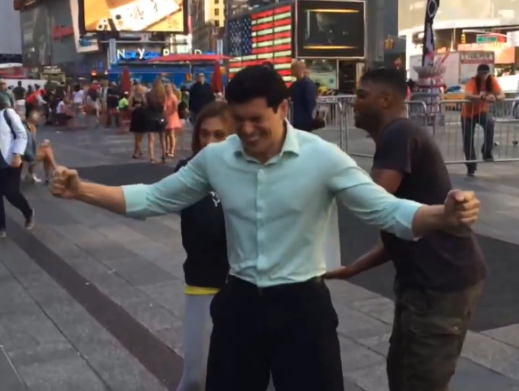 Studpuppy on the rise David Muir has just recently planted his hot ass in the anchor’s chair of ABC Nightly News, propelled I’m sure in part by the compelling work he does such as when he spotlighted an African American ballet dancer a few days ago. Apropos of nothing, he chatted with her in the summer sunshine, showing off his tan in a short sleeve black polo. His arms stay bent the entire time, coincidentally showing off his meaty biceps. And when the camera catches him just right in profile, check out his perky pecs bulging to sweetly.