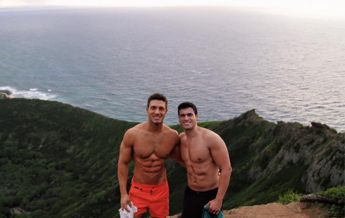 And of course I’ve been wishing and praying to the homoerotic wrestling gods for 2 years for the Latino beefcake news pin-up boy to be a certified ‘mo. And in recent weeks, like the rumble of the gods preparing to scatter manna from heaven, a certain sizzling hot hunk started showing up side by side with Gio in his Instagram photos, working up a lather of sweat and baby oil on the beach, sight-seeing, hiking. Sure, statistically speaking, it was probably likely that Gio wasn’t a member of the family, and that this was some hottie birds of a feather flocking together coincidence, because even young and pretty straight boys seem to gravitate toward one another.