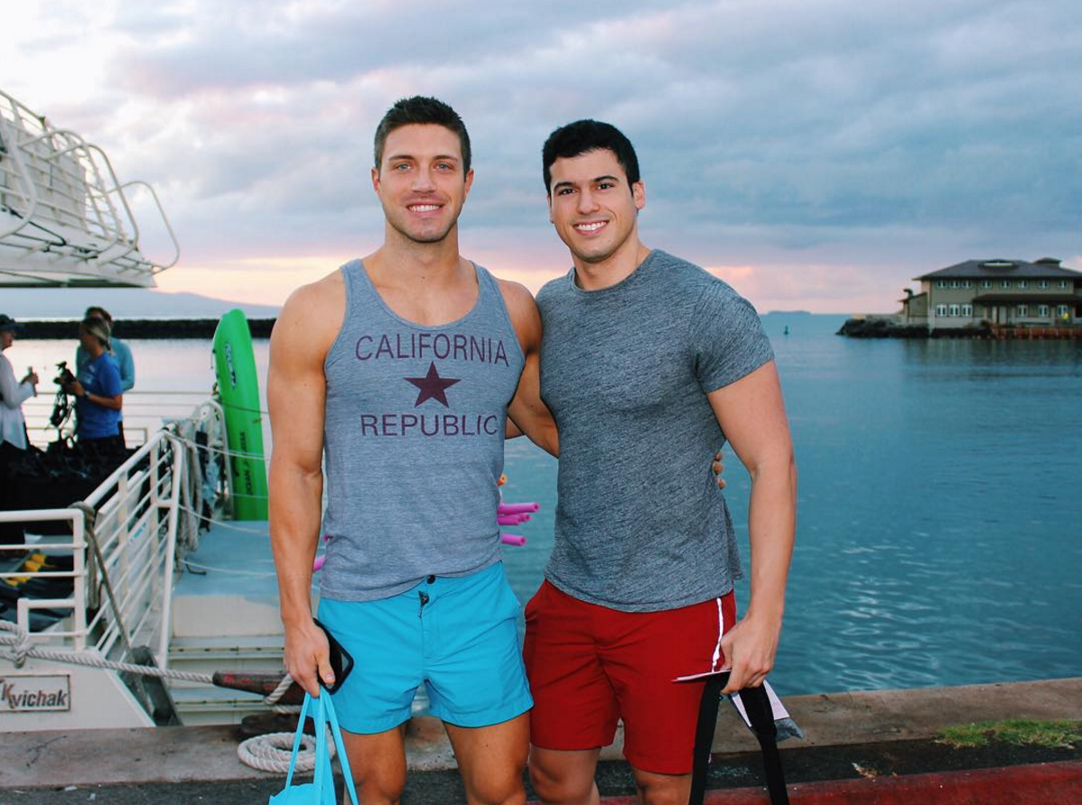 Olympic snowboarder Gus Kensworthy and his ripped beardaddy boyfriend Matthew Wilkas have apparently been similarly getting their hot bodies soaked at the foot of a waterfall, only in their case it was apparently in Hawaii. I’m not into coincidences. So of course, I read Gio and Tommy’s follow up waterfall hot shots as a direct challenge to the gay fantasy couple Gus and Mattie.