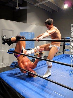 Enjoying photo previews of soon-to-be-released matches feels a little like that giddy moment when you know someone well enough to ask them out on a first date. There’s definitely something attractive about the glimpses Can-AmMax gives of Pro Challenge, but we have precious little to really go on. So, in the meantime, we’re left to fantasize about what’s yet in store, what we’ll learn and witness and, hopefully, fall in love with when we get our eyes on the actual action. I feel confident that we can expect to see some all-in, extremely well-formed homoerotic wrestling characters, because both Jobe and Cameron have resumes longer than my arm proving that they know how to sell a story. Based on the photos, both hunks look like they were in seriously fit shape for this taping. Of course, it seems like a solid guarantee that there will be an abundance of trunk-spectacle, considering Cameron has one of the most eye-catchingly luscious asses in the business and Jobe has one of the most eye-catchingly packed pouches.