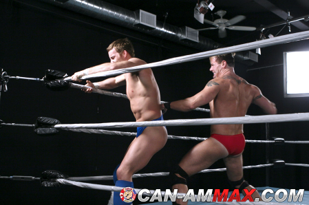 Enjoying photo previews of soon-to-be-released matches feels a little like that giddy moment when you know someone well enough to ask them out on a first date. There’s definitely something attractive about the glimpses Can-AmMax gives of Pro Challenge, but we have precious little to really go on. So, in the meantime, we’re left to fantasize about what’s yet in store, what we’ll learn and witness and, hopefully, fall in love with when we get our eyes on the actual action. I feel confident that we can expect to see some all-in, extremely well-formed homoerotic wrestling characters, because both Jobe and Cameron have resumes longer than my arm proving that they know how to sell a story. Based on the photos, both hunks look like they were in seriously fit shape for this taping. Of course, it seems like a solid guarantee that there will be an abundance of trunk-spectacle, considering Cameron has one of the most eye-catchingly luscious asses in the business and Jobe has one of the most eye-catchingly packed pouches.
