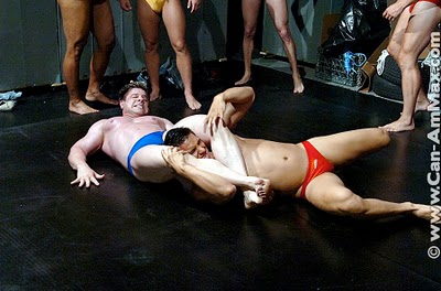 I’m frequently chastised for overanalyzing the homoerotic wrestling industry. I don’t mind being chastised, though (throw in some bodyscissors and I quite enjoy it, in fact), so I’m going to arm-chair theorize with all due humility to those who actually produce homoerotic wrestling and perform as wrestlers (for whom I have nothing but respect). I think sweet, sexy, Latin heartthrob Rio Garza is presently significantly overexposed. After appearing in a head-to-head beatdown at the hands of Aryx Quinn last October for BG East, in April, he was the centerpiece of Can-Am’s Arena 3, getting double-teamed by a couple of Can-Am regulars before reprising his BGE 1-on-1 with Aryx.