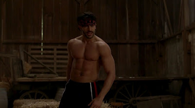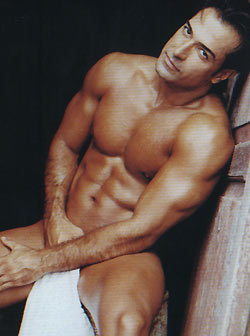 Discovering that Sendhil Ramamurthy was back on television and shirtless stoked some sizzling hot embers he first lit when I fell in lust with him on Heroes. He appeared in a couple of fictional wrestling matches I wrote, but the height of homoerotic wrestling fantasy would be to see him climb into the ring and discover beefy pornboy kombatant Marcus Ruhl staring down at him. There’s no way that the tidal wave plowing into him would leave sensational Sendhil anything other than flat on his back with knees in the air, but I think he’d make the pornboy work hard for it. One way or another, however, there’s a pony ride in Sendhil’s future appearances in my imagination (with Sendhil as the pony, of course).