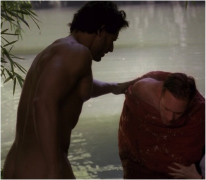 Discovering that Sendhil Ramamurthy was back on television and shirtless stoked some sizzling hot embers he first lit when I fell in lust with him on Heroes. He appeared in a couple of fictional wrestling matches I wrote, but the height of homoerotic wrestling fantasy would be to see him climb into the ring and discover beefy pornboy kombatant Marcus Ruhl staring down at him. There’s no way that the tidal wave plowing into him would leave sensational Sendhil anything other than flat on his back with knees in the air, but I think he’d make the pornboy work hard for it. One way or another, however, there’s a pony ride in Sendhil’s future appearances in my imagination (with Sendhil as the pony, of course).