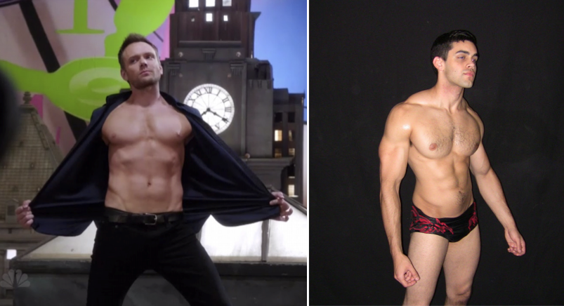 Joel McHale not only graduated from an institution that I did, he also grabbed a whole lot of attention when he disrobed for the first time on his network television show Community, instantly earning him a spot in the crowded field of funny men hunks I lust after. While I don’t follow Community faithfully, it’s a sentimental favorite of mine for no other reason than Joel’s mouthwatering pecs. I think this giant funny man could have no better greeter when he enters a wrestling ring than ice-cold and entirely humorless Muscle Master Kevin, boss-in-chief and stunningly pectacular CEO of Muscle Domination Wrestling. No shit, the initial stare down would be between Master Muscle Kevin’s baby blues and Joel’s mouthwatering nipples (because you know Kevin wouldn’t deign to look up). The muscle master very well might bite off more than he can chew in ripped comedian Joel, who I think harbors the deep cynicism of a serious heel-rising. But I have to think even with the size disadvantage, Master Muscle Kevin would slowly beat the tallboy down to size, humiliate him, terrify him, and teach him crucial lessons Joel would need to learn to own the ring as the heel he harbors deep inside.