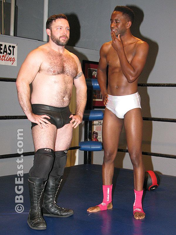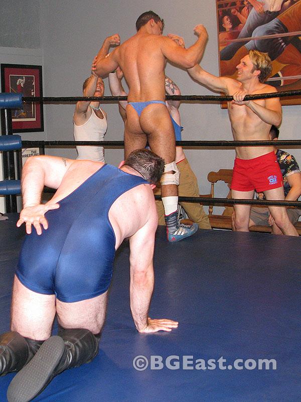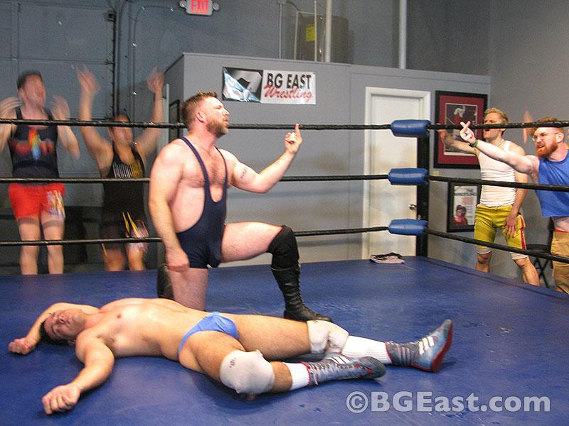 Monstah Mike is nearly muscle beast enough to knock them both on their asses, and STILL I say his dominating power is not oversold. But it’s when Jonny and Brad really start hitting their stride and beating the living fuck out of the amazingly pretty bodybuilder that this compelling drama turns into my favorite type of porn. Just like they did when Brad made his huge (HUGE) comeback last November, double-teaming achingly pretty muscle twink Kal Connor in The Comeback 3, the BFFs synchronized offense is a thing of beauty. Their double-team corner work is one of the highlights for me, when Brad, on the apron, has Mike trapped in a chin lock and nipple clamp, while Jonny, inside the ring, is clawing the fuck out Mike’s balls and biting his other nipple. Honestly, I’d have my money on Mike if he was taking on almost any other pair of BG East wrestlers on the roster, but against these diabolical heel/babyface wonder twins, he’s just a high protein lunch special.