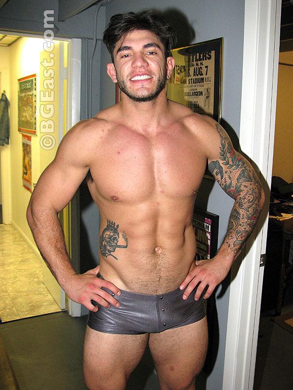 “Holy shit, look at the size of this guy!” Jonny Firestorm appears genuinely impressed, when he and his long-time BFF Brad Rochelle stride into the ring room to find Monstah Mike flexing. “That’s a lot of man,” Brad agrees, equally as awed as Jonny is by what they see at the start of Three-Way Thrash 6: Bodybuilder Beatdown. What they see is awesome by any measure. Mike is a fucking specimen! The official numbers put him at 5’10 and 230 pounds, but the numbers can’t capture the pull of gravity this sculpted bodybuilder possesses. He’s come on like a house on fire since setting foot at BG East just last year and immediately winning Best Butt of 2023. Dude is dripping with big boss attitude and more than enough gargantuan muscle to back it up. Last year I called him “fucking amazingly pretty,” and despite seeing him chew up and spit out opponents one after another ever since, I stick by it. Yeah, yeah, he’s a fucking muscle monster(ah). He’s got serial killer facial hair and dazzlingly dangerous power. I buy it, without a doubt. Mike’s a fucking force of nature, not to be fucked with lightly, if at all, and badass to the core. But what makes all of that even more astonishing, is that he’s fucking gorgeous.