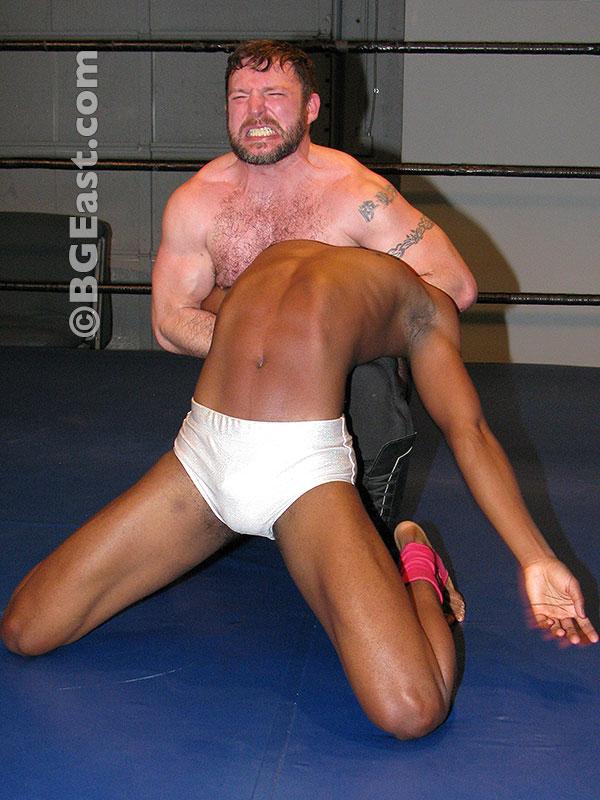 Monstah Mike is nearly muscle beast enough to knock them both on their asses, and STILL I say his dominating power is not oversold. But it’s when Jonny and Brad really start hitting their stride and beating the living fuck out of the amazingly pretty bodybuilder that this compelling drama turns into my favorite type of porn. Just like they did when Brad made his huge (HUGE) comeback last November, double-teaming achingly pretty muscle twink Kal Connor in The Comeback 3, the BFFs synchronized offense is a thing of beauty. Their double-team corner work is one of the highlights for me, when Brad, on the apron, has Mike trapped in a chin lock and nipple clamp, while Jonny, inside the ring, is clawing the fuck out Mike’s balls and biting his other nipple. Honestly, I’d have my money on Mike if he was taking on almost any other pair of BG East wrestlers on the roster, but against these diabolical heel/babyface wonder twins, he’s just a high protein lunch special.