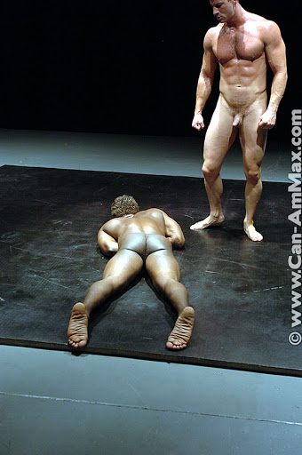 Less surprising is Thunder’s Arena’s Big Sexy owning my lustful allegiance in Battle Space 45.  If there’s a “total package” in homoerotic wrestling these days (by the way I estimate packages, at least), Big Sexy probably has the best claim.  He’s smart and funny, highly skilled on the mats, handsome as hell, beautifully built, one of the most fuckable asses on the planet, and all of that beautiful artwork!  Both an artist and a work of art, I’m entirely a Big Sexy fanatic when he steps onto the mats with the entirely tattooless muscles of a muscle star, Muscles.