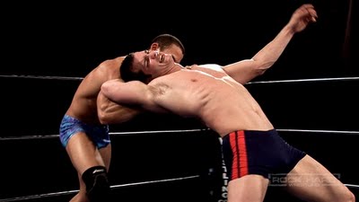 Cage Thunder: You know, I don’t really have a ‘type,’ per se. I’ve been accused of being a body fascist more times than I can count, but it’s not true. I like big guys, I like small guys, I like lean guys, I like bears—I like all different types, really—and at BGEast I’ve had a broad range of body types to wrestle; from little guys like Boyd Hicks and Kid Karisma to pretty muscleboys like Goldenrod (what a fucking poseur he was!) to big guys like Alexi Adamov and Drew Russell. I’ve always had a thing for classic heels, like Stan Hansen and Arn Anderson, but I also like the lean muscle studs like Kevin Von Erich and Randy Orton…. Oh! I know who—Ryan Kwanten from “True Blood.” Put him in some skimpy white trunks, white leather knee-high lace up boots, some white kneepads…oh HELL yeah. He’s my current fantasy opponent. You want to write that one up?