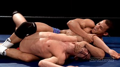 Cage Thunder: (laughing) As I said earlier, I’m pretty flexible, so I can be stretched a lot further than just about anyone. Usually guys are screaming out a submission long before they get stretched out as far as I can go. The great irony is that I am SO flexible that I can’t really stretch myself as far as I need to be stretched on my own; I need someone else to stretch me. So when someone, you know, puts me into a banana split or a Boston crab, it DOES feel good—the stretch feels incredible to me because I can’t stretch myself like that on my own. But that’s not really what you asked, was it? It’s really a primal, masculine thing. When you’re dominating another man, you’re proving yourself to be the better animal. And its arousing—very much so. In wrestling, your body is your weapon, and you’re proving your body is better, you’re stronger, more dominant, more masculine…how can your cock NOT get hard?