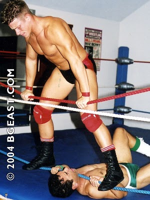Bard: That’s a fantastic menu! I love to hear that you boys mix it up with trash talk online. Nothing, but nothing hotter than an erotic grudge match! And I’d love to see you give Kid K a go! But I warn you, if you found Gabriel Ross’s hot bod distracting, you’d better include some hardcore tantric meditation to your training schedule, because you wouldn’t be the first challenger to get completely thrown off your game plan when he shoves that world class ass in your face and flexes for you. I definitely want to see that match happen… from the front row! Since you’ve been a BG East fan for a while, who are some of the classic wrestlers who’ve retired from the scene that you would’ve liked to have faced in their prime? And what are some highlights of what those fantasy matches would have entailed?