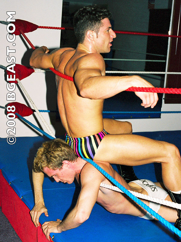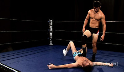 A couple of Watchfighters matches I’ve reviewed on the blog stand out for me. The first I want to mention is the growing Uruguayan production house headed by Muscles77 (who wrestled for BG East a while back as Marcelo Muscle). The crew behind matches like Muscles77’s match against Rocky Big Guns opens with a slow motion survey of both hardbodied wrestling hunks in turn, posing, flexing, sneering with cocky confidence at the camera as this unhurried, electronic melody with (mabybe?) a South American sensibility provides the soundtrack to our eye fucking, giving us time to decide whose mouthering muscles we want to see on top.