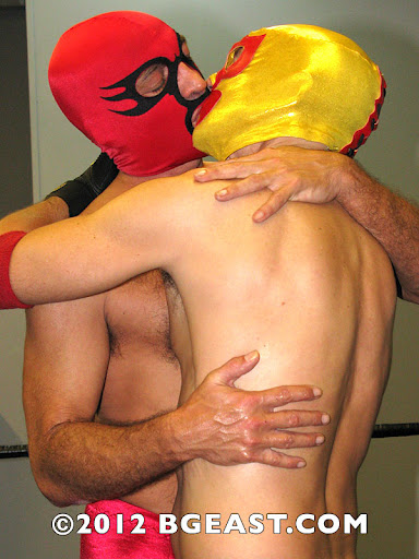 But back to my original point… there are plenty of moments when watching two beautiful men pound the hell out of each other and sell some convincing aggression will be all I need to completely exhaust myself. But there are some periods, such as the one I’m in now, where I absolutely crave the homoerotic component of my homoerotic wrestling. A literal, lingering grab of the ass can catapult me into a deeply satisfying, body-affirming, gay-affirming, passionate place that without it, can leave me feeling a little desperate. The BGE classic, Tommy Lopez, in a mutual, tender ass grab in the midst of a sweaty, snarling smack down is the value-added that I’ve got a major lust for these days.