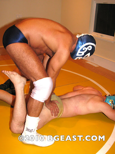 Rafe and/or Cage Thunder fans will already know that these two have very notoriously met in wrestling action before.  They collided in the BG East ring, and the overt, explicit erotic intent of both studs burned my retinas just a tad.  As one might expect, Cage Thunder owned lovely Rafe in the end, or, more accurately, owned his crotch as he sat on Rafe’s unmasked face and insisted that the graceful, smooth stud pound out a submission-emission.  I’m guessing after that match, there were words exchanged, perhaps a little advice shared from the veteran to the ever-ready lean sex machine.  Somewhere, Rafe picked up Cage’s disparaging nomenclature for Mitch.  And somehow, when Rafe slaps down the taunt right smack in the middle of his mat match against Mitch, it feels to me like almost a 2-on-1 opens up, putting my longtime infatuation with Mitch at a distinctly unfair double-team advantage.