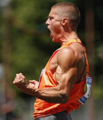15 minutes later, the roar of the crowd again greets another competitor. Veteran Czech decathlete, Roman Sebrle strolls confidently across the track and into the infield to climb into the ring.  The oldest competitor in the tournament, he’s starkly handsome and draws stunned gasps as the crowds see his gear.  He’s wearing a classic posing strap made famous in the old AMG wrestling videos of the 50’s and 60’s.  He stands in the center of the ring impassive, his muscles relaxed, his arms hanging loosely at his sides, somehow astonishingly fierce for being so thoroughly calm and cool.