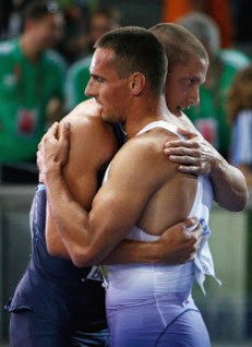 The humiliated German wrestler, Pascal Behrenbruch, is the captain of the final team in the 4-way gold medal match.  The look on his face as he strides across the track toward the infield communicates with crystal clarity.  He’s back to redeem his shockingly pitiful showing in the individual competition.  His smooth, tan body is oiled; his muscles are pumped; and he’s replaced his destroyed golden trunks with a more modest baby blue speedo.