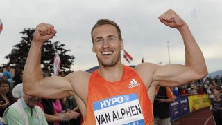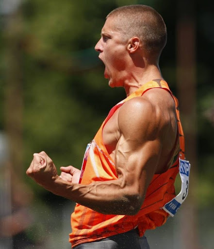 Next to come sprinting out of the locker room and into the infield is the Belgian beauty, Hans van Alphen.  He’s cleaned up and rehydrated from his semi-final humiliation at the hands of Trey, and he’s somehow reclaimed the black and yellow trunks that he lost to the American.