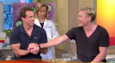 In his Los Angeles network office, Eli smiled at his new contract-employees from behind his desk. In two leather winged-back chairs directly in front of him sat his East Coast talent, Chris Cuomo and Chris’ broadcast partner Sam Champion. Chris had sex written all over him, from his dark curly hair to his hard body to his massive hands. Chris was in his traditional navy pin-striped suit and bright red power tie cinched up around his thick neck. A Harvard trained attorney, Chris was plucked from the drudgery of the legal world when his Titan first saw him giving a statement to the press on behalf of a client he was defending. The camera loved Chris, and Chris quickly felt the love of a loyal fan-base tuning in to see him read the news on the East Coast morning program. Sitting in Eli’s office, Chris looked confident, but every so often his awkward, boyish grin revealed his nervousness. His broadcast partner, Sam, was blond, blue-eyed, and softer than Chris, but he had a hardcore edge about him that Eli expected would blossom into a first class heel. Sam was plucked from a local affiliate to join the East Coast morning program at the same time Chris started his broadcast career there. Both men enjoyed an easy friendship on camera, but off camera, they were highly competitive, sometimes agressively so, with one another. Sam came to Eli’s office in a casual pink polo shirt and brown slacks, looking like he was ready for a southern California vacation.