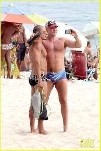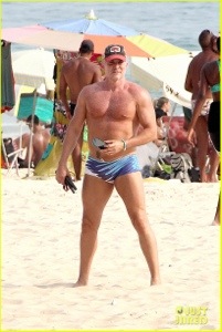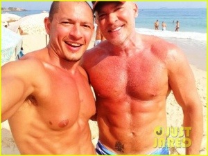 An hour later, all six men were on the beach. Rob, Thomas, Carter and Richard stood in speedos and tank tops at the bottom of the stairs winding down the cliffside from the house to the beach below. Chris and Sam were walking out onto the otherwise deserted beach. Chris wore the tight, navy blue speedo that he found in his room an hour earlier, with a white tank top that had to stretch across his broad chest. His skin seemed to soak up the California sun, turning a dark Mediterranean tan by the second. He had dark, curly brown hair. His shoulders were broad and round, and his arms were well-muscled and vascular. His thighs were relatively slender, but corded with muscle born of distance running. Sam was dressed in an emerald green speedo and a sky blue t-shirt. Sam was slightly shorter than Chris, with pale Nordic features and blond hair. Sam was fit, thickly muscled but less defined than Chris.