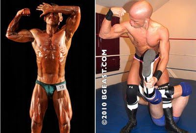Versatility turns me on, as well, and my reigning homoerotic wrestler of the month can tell more than one story. Teamed up with too, too tweezed go-go boy rookie Chace LaChance, Lon was also convincingly one half of pretty-in-peach, going down in two out of three to big, nasty Donnie Drake and his sadist apprentice, Doug Rand. Babyface heroes who battle valiantly but are bested by crafty shortcuts and vile double teams are beautiful to behold. When Lon is knocked out cold and laid out defenseless and vulnerable next to his pretty partner in the middle of the ring, all that gorgeous muscle so helpless and humiliated makes me gasp.