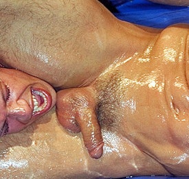 Okay, this probably belongs earlier in the quiz, because you can see most of this homoerotic wrestler’s opponent’s face, hovering ominously open with his chin resting on the hunk’s testicles. Classic doesn’t quite cover the hardbodied homoerotic wrestler to whom this oiled up cock belongs. Prototypical? Pioneering? I always forget this wrestler had a first name, because like so many iconic entertainers, it really only takes his last name to be clear who we’re talking about (though an entirely correct answer here will require both names!). He reportedly wrestled at 204 pounds of sliced to the joint muscle on his 6’0 frame in around 15 matches (give or take), and was said to also have worked behind he camera as well on many more. I’d tell you more, but this wouldn’t be so much of a quiz, then, would it?