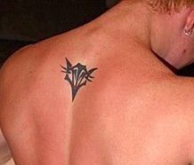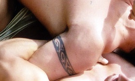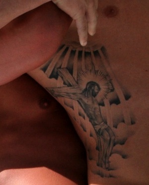 Returning to the theme of “commitment” exemplified by body art, this portrait of Jesus being crucified, inked across the rib cage of a homoerotic wrestler is full of delightful contradictions and irony. A believer this devout who pops up repeatedly in wrestling matches marketed (let’s face it) primarily to the gay wrestling kinkster just makes me smile. And then there’s the iconic image of abject suffering sketched across the hot body of a rookie who, let’s face it, suffers a whole lot in one humiliating wrestling match after another. Well, to be honest, he’s been in one published product, in sort of a daisy chain of wrestling scenarios, roughly sketched out as two “matches.” In the pay-site, you can just recently also find him getting a wrestling tutorial from another awesomely tatted wrestler who was a former “Name That Tat” answer. And for that matter, the muscle opponent crushing this homoerotic wrestler in the pic above was also a “Name That Tat” answer. The crucifix stud above is 5’8″, 170 pounds, with a frat boy face that turns me on when it’s twisted in agony.
