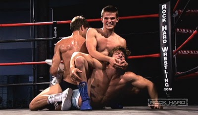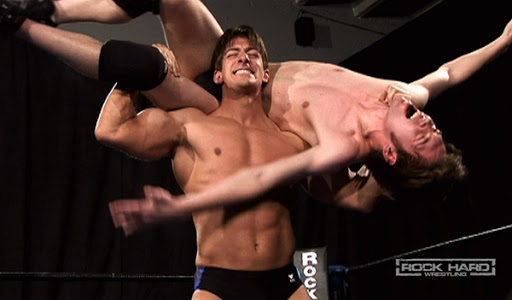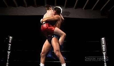 I’m not entirely sure I’m finishing this post in the same spot where I started it, but let me just conclude by saying this is what gear is meant for in homoerotic wrestling: getting removed. Whether it’s in the form of a vicious wedgie that reveals the gorgeous glutes beneath, or if it’s in the form of ripping the extraneous garment off entirely, gear inevitably stands between me and the next level of homoerotic pleasure. While it’s certainly true that I can be entertained with hot wrestling involving all gear staying firmly in place from start to finish, if there are any wardrobe malfunctions (and especially the intentional ones), it ought-a be a law! Leave gear where ever the action takes it, especially if that’s stretched so high up Z-Man’s ass crack that it makes the muscleboy gag!