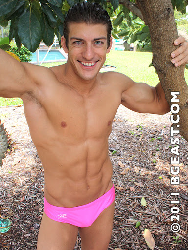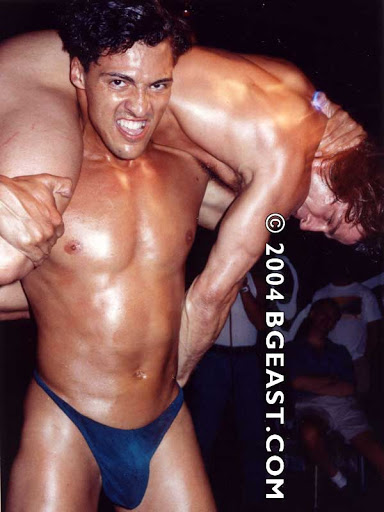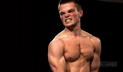 And speaking of hard, and just to complete this stream of consciousness ranting, this makes me think of the truly remarkable rookie debut four months ago of seriously entertaining grappler, Adonis, running circles around Gianni Luca and tying the Italian up in knots. NK gives points for getting your opponent’s gear off of him. They get special points in round 2 when they can yank their opponent’s jockstraps over their heads, as opposed to just ripping them off. Adonis illustrates his tenacity and determination by working the “over-the-head” points in round 1, when Gianni is still in his speedo-style trunks. Cranking on Gianni’s skimpy red trunks like there’s no tomorrow, Adonis rips the crotch out of them and slowly manages to stretch them up and over the Italian jobber’s head and eventually entirely off his body. Not only is this a feat, in and of itself (buy a pair of speedos and just try this!), Adonis doesn’t skip even a beat as he performs this maneuver while simultaneously maintaining complete control of Gianni in one completely dominating, crushing, humiliating hold after another. We need to see Adonis and his gorgeous tool in action again!
