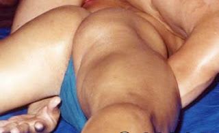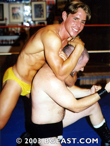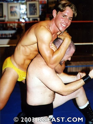 So there’s no quiz for you this week. Considering school’s out and the grads are still hung over, I figure you deserve a break from test-taking. I’ve also been abundantly distracted by my first taste of the juicy new releases from BG East. I’ve been trying to pace myself and drink plenty of fluids, but one moment in Fantasymen 33: Muscle Pros keeps grabbing my attention. At one key point in the development of the match, Z-Man is appropriately taking a well-earned, nasty beating from Kid Karisma. They’ve both given and taken their fair share of pounding, but now Kid K has beaten the mocha-skinned muscle model into submission, and then added a gratuitous ball claw on the pretty boy just to seal the deal. Z-Man is finally writhing on his stomach on the canvas, clutching his balls in agony, when Kid K bends over (just linger on those last 4 words a while…. okay, now continue), grabs Z-Man’s pink trunks, and wedgies them high up his ass.